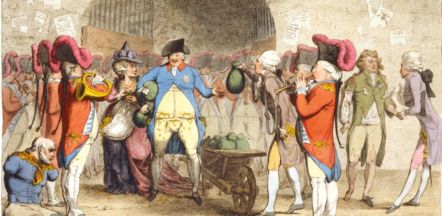 Cartoon depicting the former king of Great Britain and Ireland George III receiving funds from Prime Minister William Pitt. Authored by James Gilray in 1786.