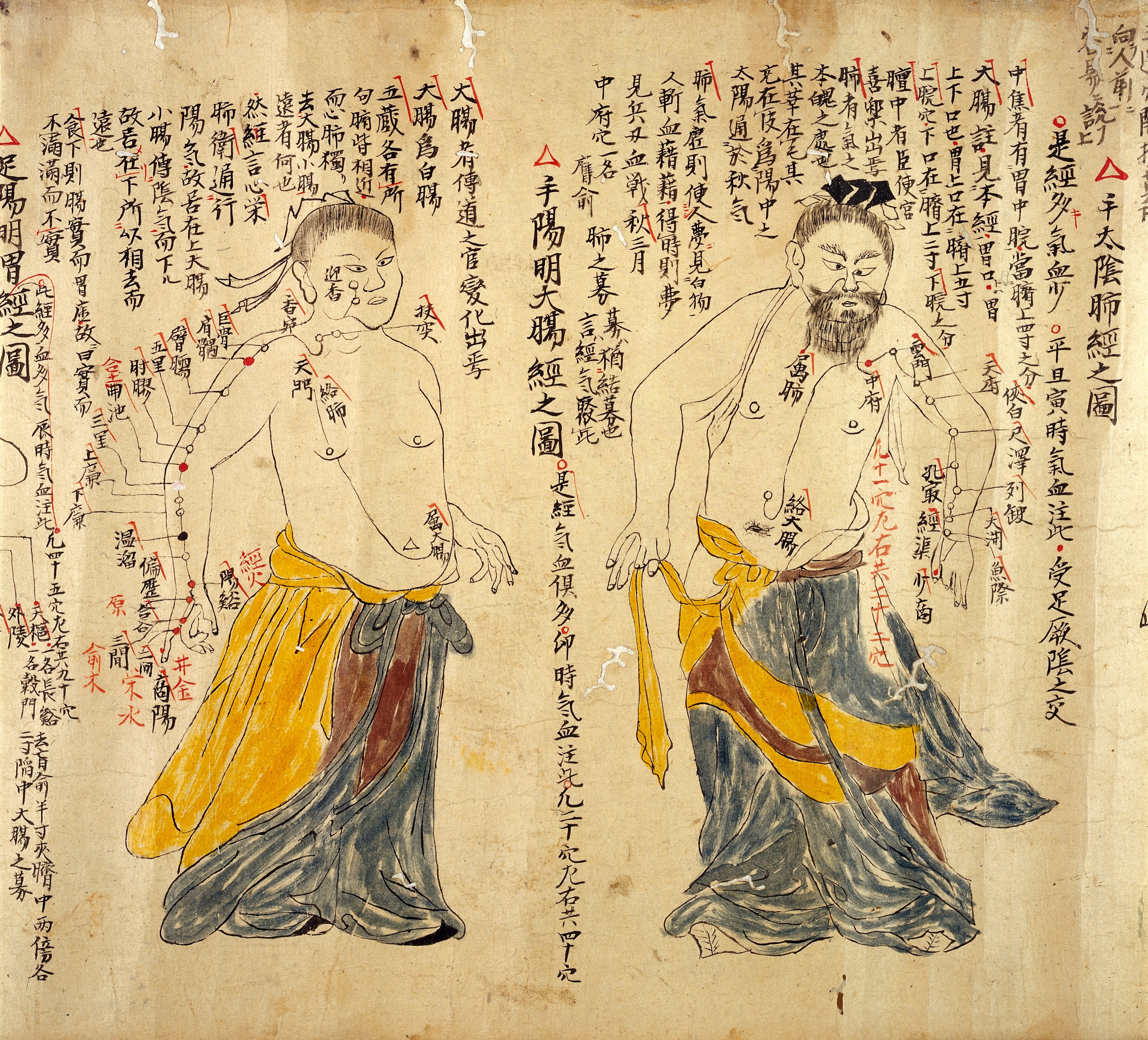 Illustration which identifies and names the acupuncture points in some of the fourteen bodily tracts on the body. This illustration is derived from Chinese medical illustrations and depicts figures whose dress, facial hair and hairstyles identify them as Chinese; Japanese reading marks have been added to the text to ease understanding. Asian Collection |