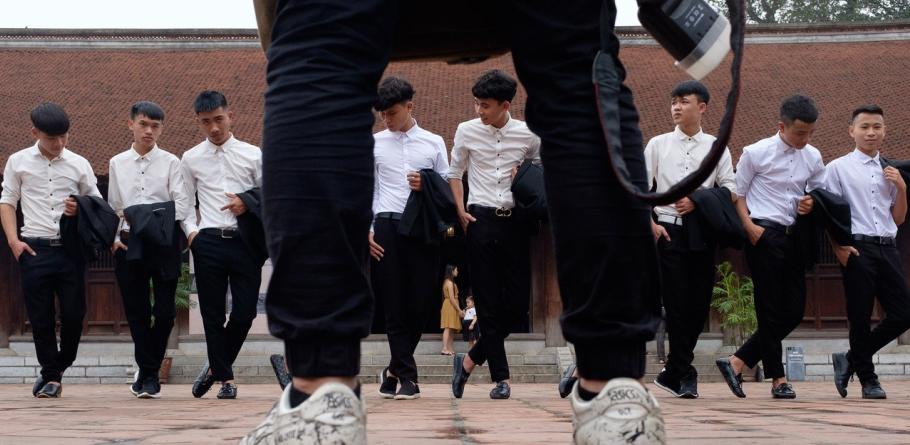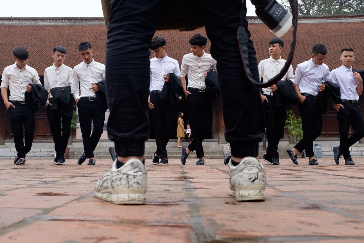 Hanoi, Vietnam 2018. Young men line up for school pictures at the Temple of Literature. Photo: Brent Luvaas.