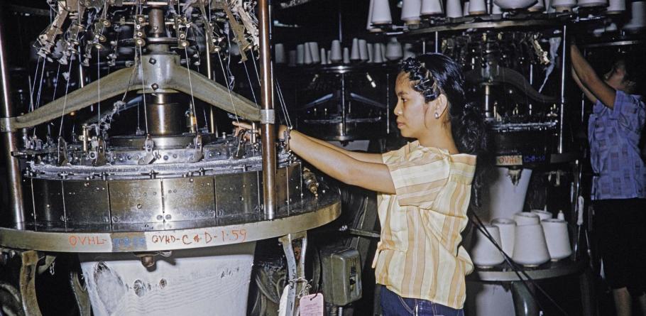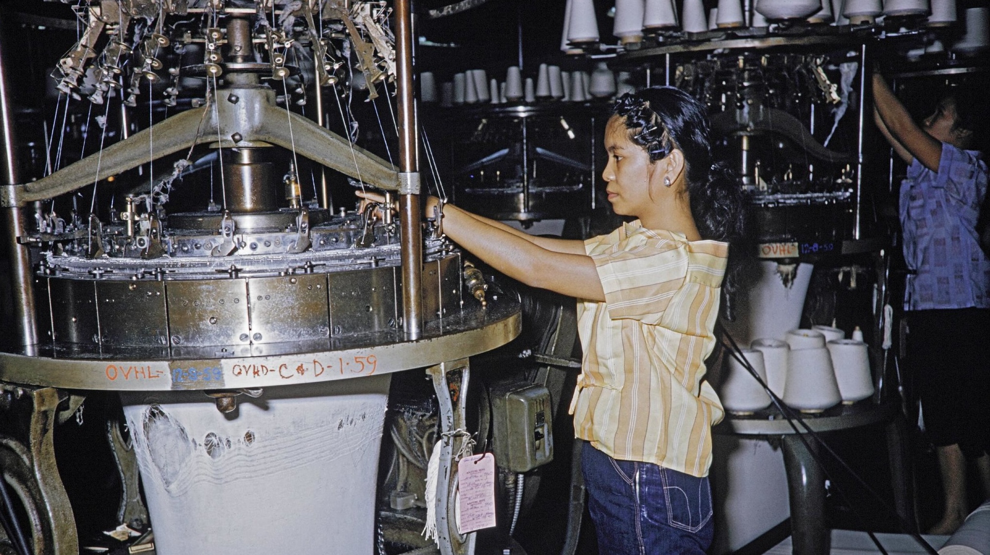 Woman operating machinery in a Philippine textile mill, 1960. Picture by Harrison Forman.