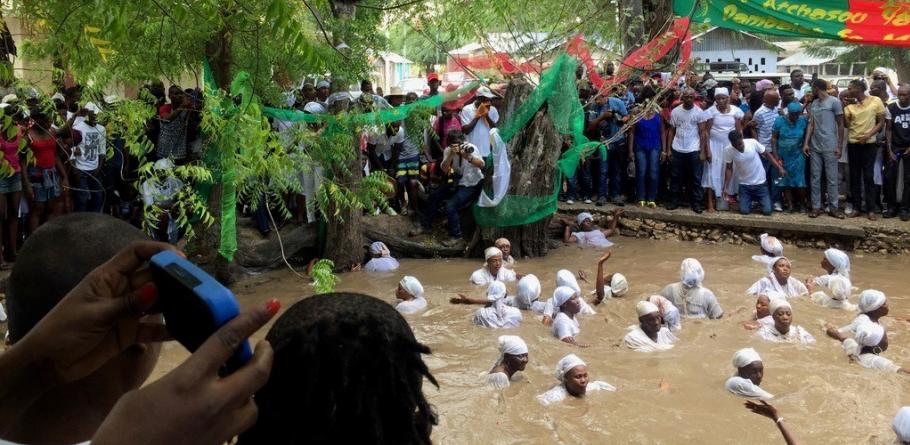 Les grands lieux du vodou en Haïti comprennent notamment les temples de Souvenance et de Soukri, tous les deux proches de la ville portuaire Gonaïves. Ils accueillent chaque année à Pâques et au mois d’août des milliers de visiteurs et de pratiquants, y compris des membres de la diaspora haïtienne. A vrai dire, toute l’année, les fêtes patronales catholiques sont investies par des vodouisants qui n’ont aucune difficulté à en faire des occasions de pèlerinage vodou. Par exemple le 16 juillet la fête de Saut d’Eau dédiée à Notre-Dame du Mont-Carmel attire plusieurs dizaines de milliers de pèlerins du vodou à une cascade célèbre entourée d’arbres considérés comme les résidences des divinités de ce culte. Souvent les pèlerins fréquentent aussi l’église locale avec le même engouement qu’ils manifestent autour de la célèbre cascade.